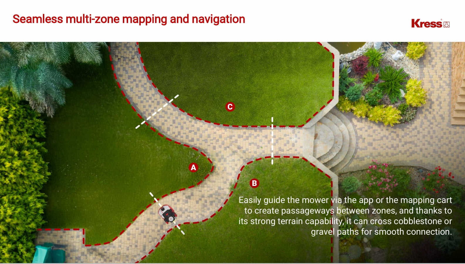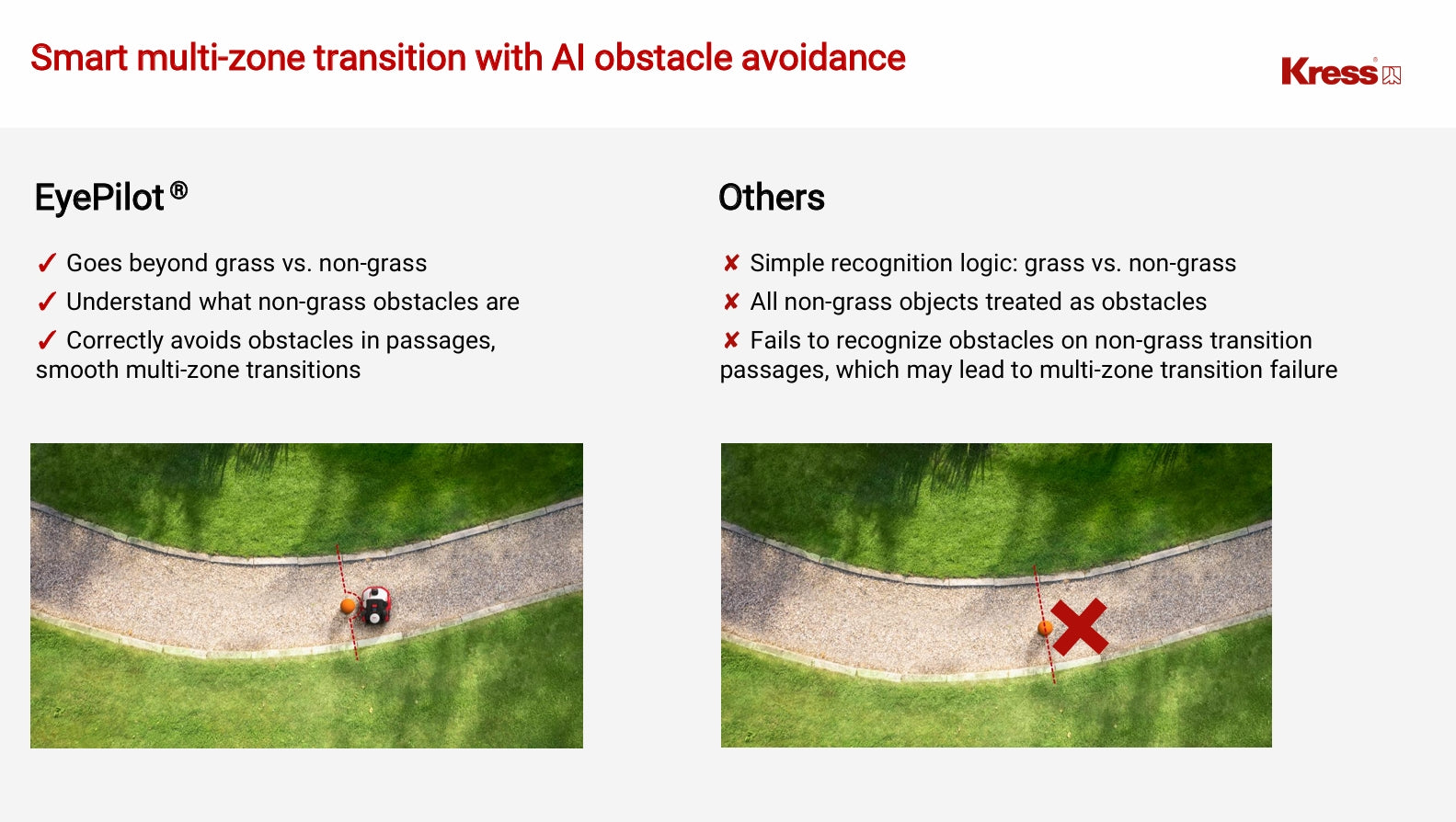 The Kress with all-wheel drive effortlessly climbs slopes of up to 80%/39 degrees and ensures precise mowing even on the steepest terrain.